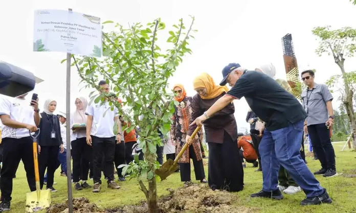 Gubernur Jawa Timur, Khofifah Indar Parawansa, bersama Menteri Pemberdayaan Perempuan dan Perlindungan Anak (PPPA), Arifatul Choiri Fauzi, Kepala Otorita IKN, Basuki Hadimuljono, dan Gubernur Kaltim, Rudy Mas’ud, serta jajaran Pengurus Pusat Muslimat NU menanam pohon maja di Plaza Bhinneka Tunggal Ika, Ibu Kota Nusantara (IKN), Kalimantan Timur, Senin (12/5/2025). Penanaman pohon ini menandai kolaborasi lintas sektor dan daerah dalam semangat membangun IKN sebagai simbol peradaban baru Indonesia.
