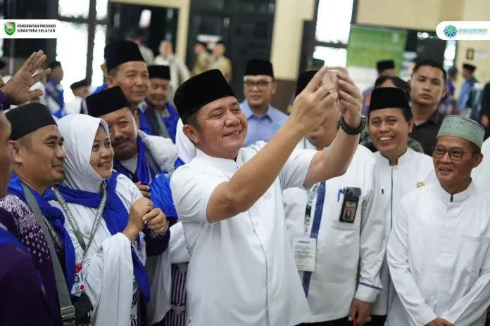 Gubernur Sumatera Selatan, H. Herman Deru (HD) melepas keberangkatan jamaah haji tahun 1446H / 2025M kloter pertama Embarkasi Palembang di Asrama Haji Palembang (Sabtu, 3/5/2025).