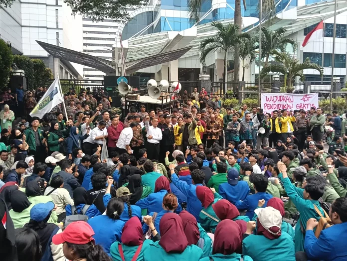 Menteri Pendidikan Tinggi, Sains, dan Teknologi (Mendiktisaintek) Brian Yuliarto menghampiri massa aksi mahasiswa dari berbagai perguruan tinggi di depan kantor Kementerian Pendidikan Tinggi, Sains, dan Teknologi (Kemdiktisaintek), Jumat (1/5).