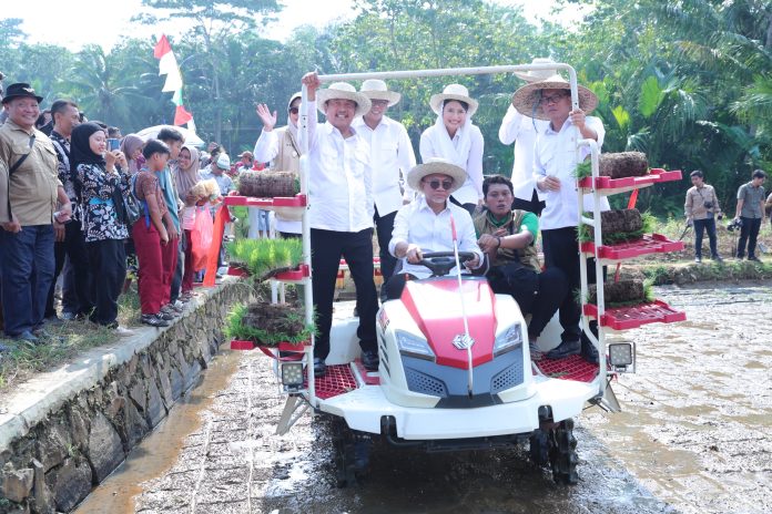 Yang unik, Menko Zulfliki Hasan didampingi Para Menteri dan Wakil Menteri serta Gubernur Banten Andra Soni menaiki Mesin Traktor Tanam Padi mengelilingi areal sawah.