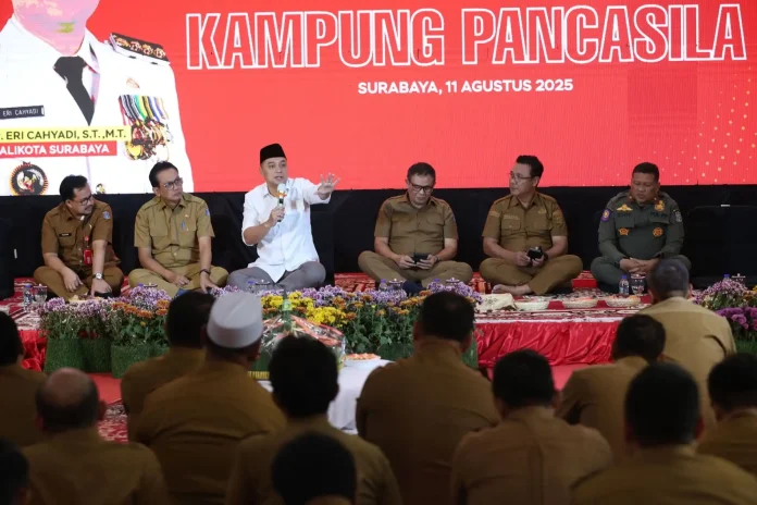 Pemerintah Kota (Pemkot) Surabaya menggelar doa bersama sekaligus mengawali pelaksanaan Kampung Pancasila di lobby lantai 2 Balai Kota, pada Senin (11/8/2025). Doa bersama ini, dipimpin secara langsung oleh Wali Kota Surabaya Eri Cahyadi dan diikuti seluruh jajaran kepala perangkat daerah (PD), camat, hingga lurah di lingkungan Pemkot Surabaya.