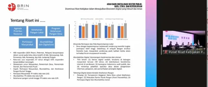 Robby Firman Syah Peneliti Ahli Muda Pusat Riset Kebijakan Publik (PRKP) BRIN menyampaikan, riset ini bertujuan untuk menciptakan tata kelola pangan desa yang transparan dan partisipatif melalui pemanfaatan teknologi digital.