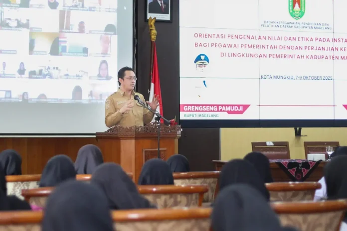 Bupati Magelang Grengseng Pamuji didampingi Asisten Administrasi Umum, Asfuri dan Kepala Badan Kepegawaian Pendidikan dan Pelatihan Daerah (BKPPD) Kabupaten Magelang, Ari Handoko membuka orientasi pengenalan nilai dan etika pada instansi Pemerintah bagi Pegawai Pemerintah Dengan Perjanjian Kerja (PPPK) Tahun 2025 di Ruang Bhinakarya, Komplek Setda Kabupaten Magelang, Selasa (7/10).