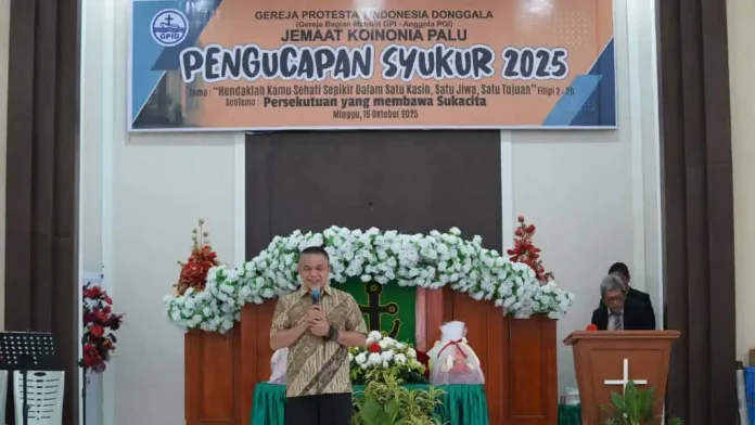 Wali Kota Palu, H. Hadianto Rasyid, S.E., menghadiri perayaan Pengucapan Syukur 2025 Gereja Protestan Indonesia Donggala (GPID) Jemaat Koinonia Palu yang berlangsung pada Minggu (19/10) di Gereja Koinonia, Jalan Tangkasi, Kota Palu.