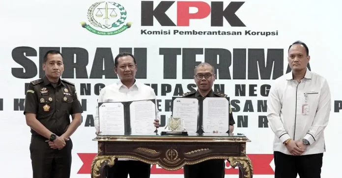 Komisi Pemberantasan Korupsi (KPK) kembali meneguhkan fokus penindakan yang tidak hanya menghukum pelaku, tapi memastikan pemulihan aset negara dengan mendapatkan kembali kerugian yang dicuri. Melalui mekanisme penetapan status penggunaan (PSP), KPK menyerahkan aset rampasan senilai Rp19,78 miliar kepada Kejaksaan Agung (Kejagung), di Gedung Utama Kejagung, Jakarta, Senin (17/11).