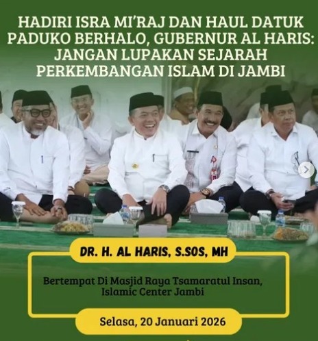 Hal tersebut dikemukakannya saat bersilaturahmi dan menghadiri Peringatan Isra Mi’raj Nabi Muhammad SAW sekaligus Haul Rajo Jambi Datuk Paduko Berhalo dalam rangka HUT Provinsi Jambi ke-69 Tahun 2026 bertempat di Masjid Raya Tsamaratul Insan, Islamic Center Jambi, Selasa (20/01/2026) pagi.