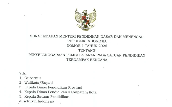 Kementerian Pendidikan Dasar dan Menengah (Kemendikdasmen) menerbitkan Surat Edaran Menteri Pendidikan Dasar dan Menengah Nomor 1 Tahun 2026 tentang Penyelenggaraan Pembelajaran pada Satuan Pendidikan Terdampak Bencana. Kebijakan ini menjadi acuan nasional bagi pemerintah daerah dan satuan pendidikan dalam memastikan keberlangsungan layanan pendidikan di tengah situasi darurat akibat bencana alam, sekaligus memastikan pemenuhan hak dasar para siswa untuk mendapatkan pendidikan.