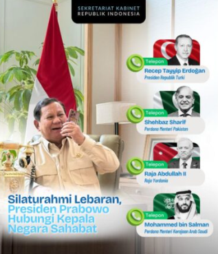 Presiden Prabowo Subianto merayakan Hari Raya Idulfitri 1447 Hijriah dengan kegiatan yang sarat makna kebersamaan dan persaudaraan. Tidak hanya mengikuti malam takbiran di Sumatra Utara, salat Idulfitri di Aceh, dan melakukan halal bihalal bersama masyarakat di Jakarta, Presiden turut melakukan silaturahmi dengan para pemimpin negara Muslim melalui sambungan telepon.