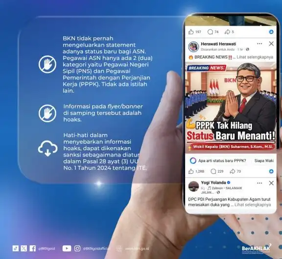 Wisudo melanjutkan, BKN tidak pernah menerbitkan pernyataan tentang adanya status baru bagi Pegawai Pemerintah dengan Perjanjian Kerja (PPPK) sebagaimana yang tersebar dalam unggahan tersebut. “Sesuai dengan Undang-Undang Nomor 20 Tahun 2023 tentang Aparatur Sipil Negara (ASN), jenis ASN hanya terdiri dari Pegawai Negeri Sipil (PNS) dan PPPK. Tidak ada skema status lain selain kedua hal tersebut,” terangnya.